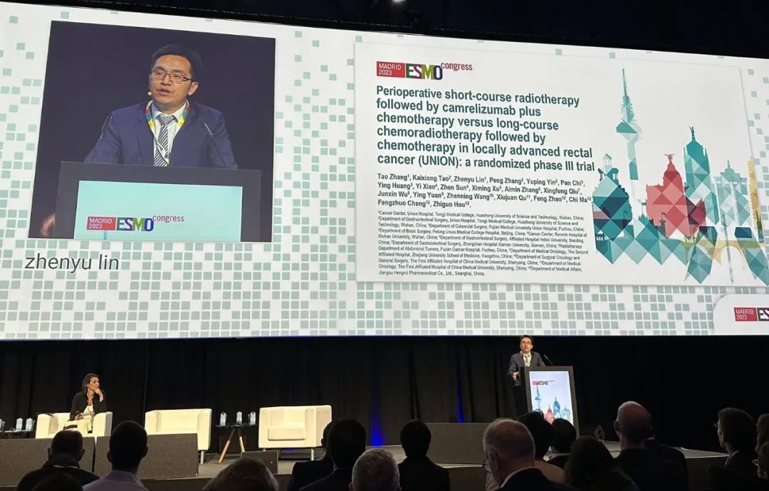 10月21日,AG真人医药创新药卡瑞利珠单抗的一项研究“新辅助短程放疗序贯卡瑞利珠单抗联合化疗对比长程放化疗序贯化疗治疗局部晚期直肠癌”随机对照Ⅲ期试验(UNION)亮相2023 ESMO大会优选口头报告现场。该研究由华中科技大学同济医学院附属协和医院张涛教授、陶凯雄教授担任主要研究者,华中科技大学同济医学院附属协和医院林振宇教授在大会现场报告了该重磅研究的结果1。此项研究是全球首个评估短程放疗序贯免疫治疗联合化疗治疗局部晚期直肠癌的Ⅲ期研究,已达到主要终点病理完全缓解(pCR),有望为直肠癌患者的治疗提供新策略。